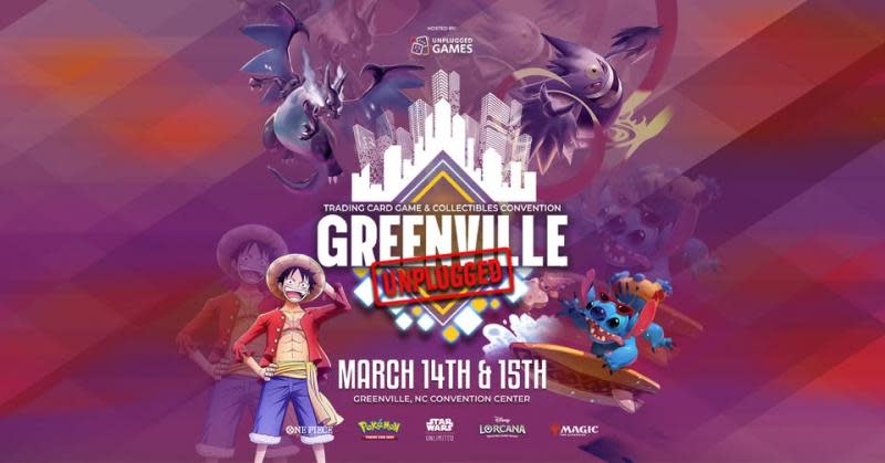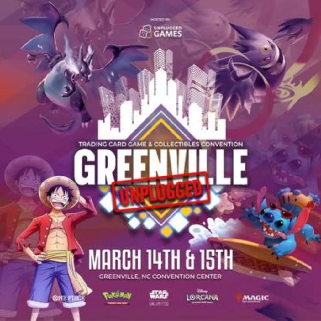 We’re thrilled to welcome you back to Greenville [UNPLUGGED]: a #TCG & Collectibles Convention returning March 14th & 15th 2026!Get ready for an action-packed weekend filled with competitive TCG tournaments, the region's BEST vendors, and more!Featuring:- Competitive TCG tournaments- 180+ TCG & collectibles vendor tables- $1 Raffles- Food trucks on-site- Casual play tablesFeaturing:Pokémon • Magic: The Gathering • One Piece • Disney Lorcana • Board Games • Tabletop Games • Funko Pops • Anime • and more!Admission:General Admission: $5Tournaments have separate entry fees.General admission is waived with tournament participation.