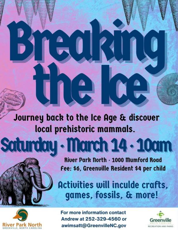 Journey back to the Ice Age with our staff as we learn about local prehistoric mammals through different activities, including crafts, games, fossils, and more! Fees are paid on day of program. Open to all ages with adult.Saturday March 14 10 AM – 12 PMFee: $6; Discounted Greenville Resident: $4 per child.For more information, please call (252) 329-4560 or email awimsatt@greenvillenc.gov