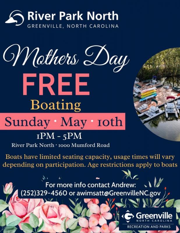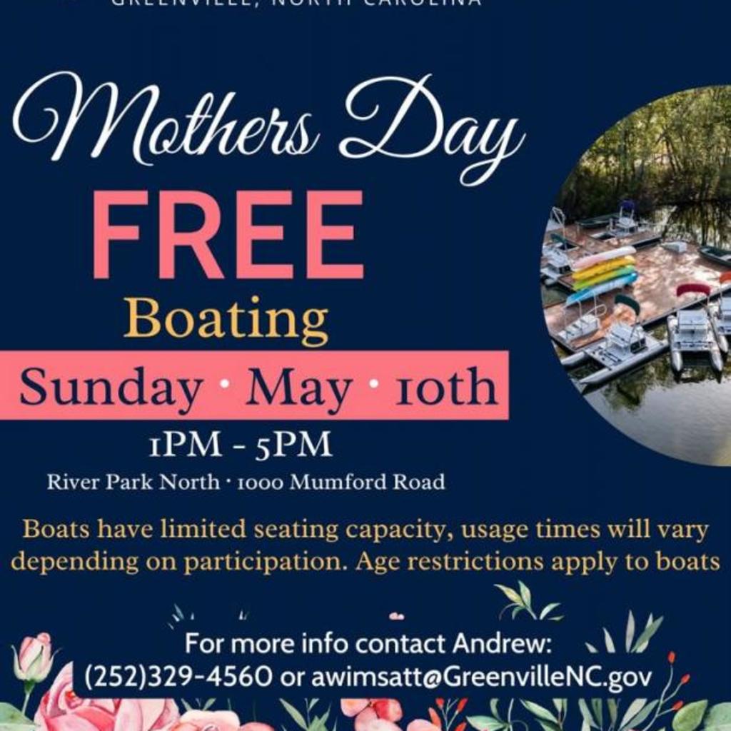 For Mother’s Day enjoy exploring our large pond using our kayaks and pedal boats for a chance to experience nature from new perspectives. Boats have limited seating capacity; usage times will vary depending on participation. Age restrictions apply to boats. Open for all ages with adult.Sunday May 10 1 PM – 5 PMFee: FreeFor additional information, please call (252) 329-4560 or email awimsatt@greenvillenc.gov