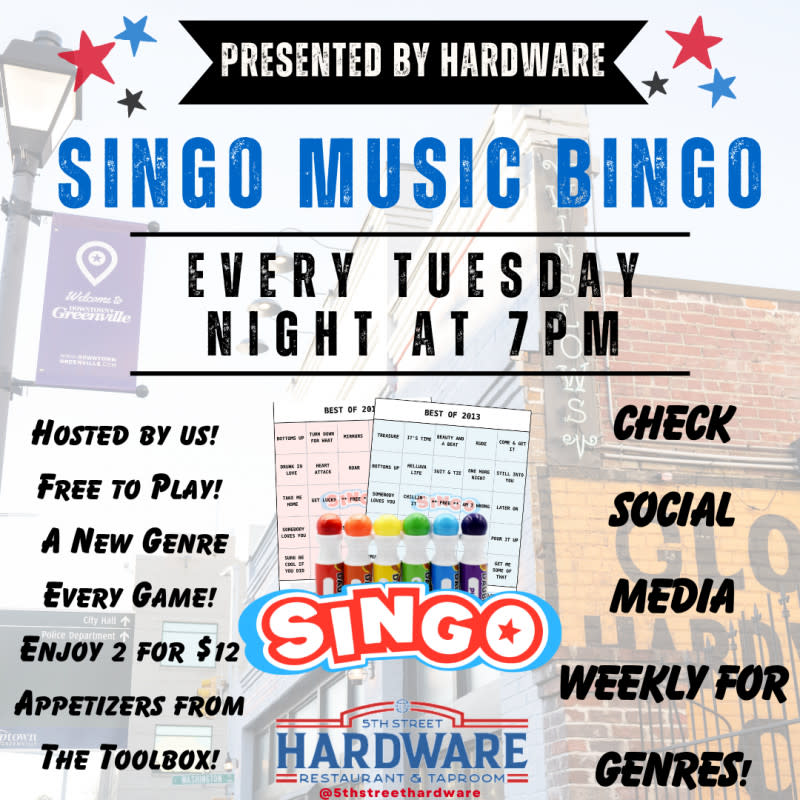 Head to 5th Street Hardware Restaurant & Taproom for Singo Music Bingo every Tuesday night at 7pm!Enjoy a new genre every game, and 2 for $12 appetizers from the Toolbox!Check social media for weekly genres!